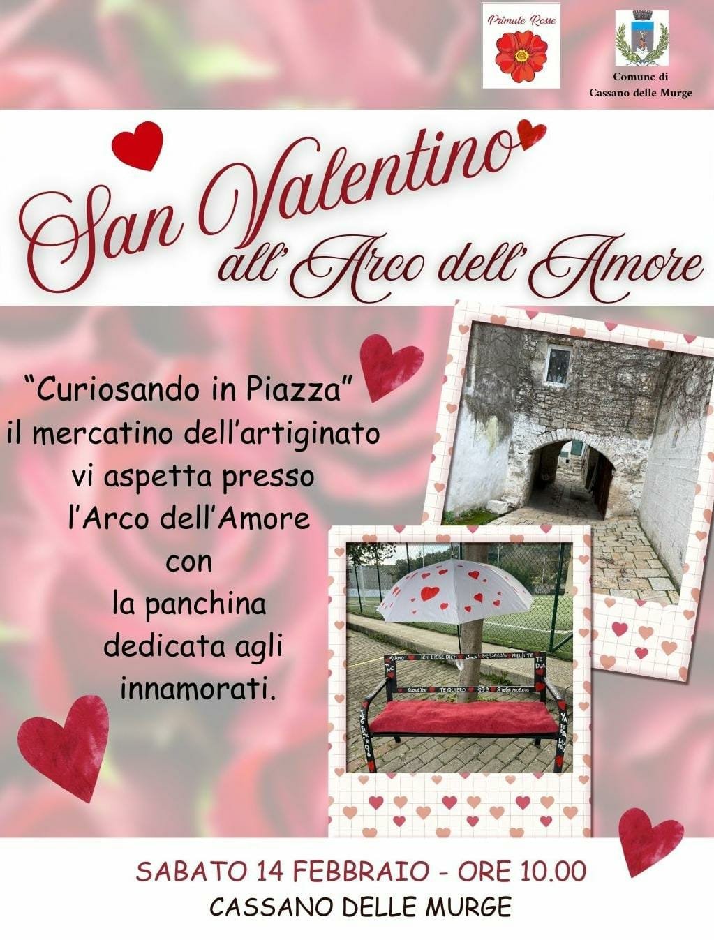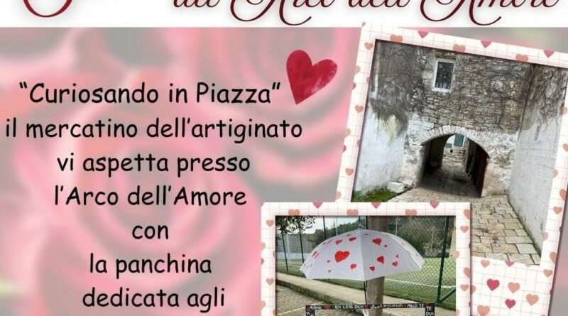 Avrà luogo domani, sabato 14 febbraio dalle ore 10:00, l’evento “San Valentino all’Arco dell’Amore”. La celebrazione della festa degli innamorati sarà il tema centrale del mercatino dell’artigianato “Curiosando in Piazza”, organizzato dall’associazione di promozione sociale “Primule Rosse” in collaborazione con il Comune di Cassano delle Murge.