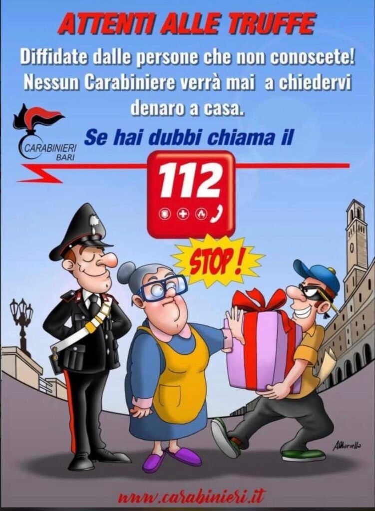 – Limitate la confidenza al telefono: in caso di persone che si presentano come parenti e vi chiedono denaro, prendete tempo e chiamate il numero unico di emergenza 112 o un parente
