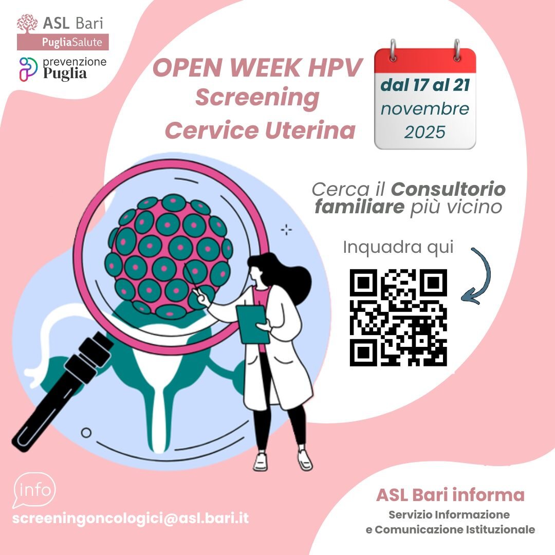 Consultori aperti per la salute femminile. In occasione della Giornata Mondiale per l’eliminazione del tumore della cervice uterina, che si celebra il 17 novembre, la ASL Bari organizza l’Open Week HPV Screening Cervice Uterina. Un fitto calendario di aperture (dal 17 al 21 novembre), ad accesso libero e senza alcuna prenotazione, che rappresenta un utile appuntamento per promuovere e sensibilizzare la popolazione su un importante capitolo della salute della donna, in particolare nella fascia d’età tra 25 e 64 anni.
