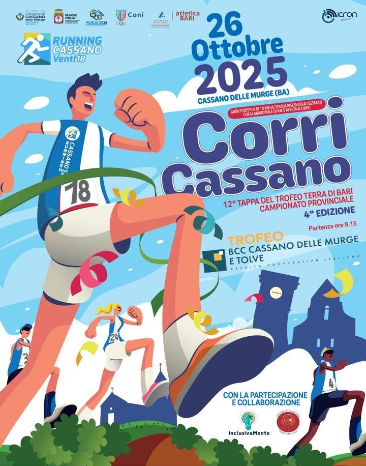Quarta edizione domenica 26 ottobre per la “CorriCassano”, gara valevole per il “Trofeo Terra di Bari” di cui costituisce la dodicesima tappa.