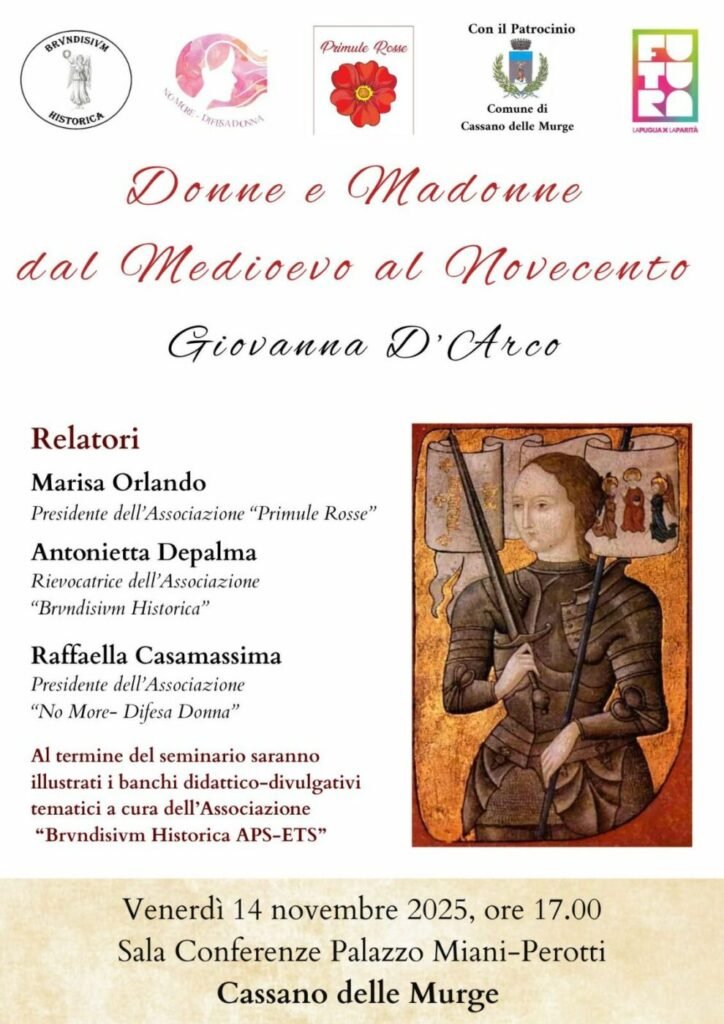 Avrà luogo venerdì 14 novembre, alle ore 17.00, il terzo appuntamento con “Donne e madonne. Dal Medioevo al Novecento”, promosso dall’Associazione “Primule Rosse” nell’ambito dell’avviso pubblico “Futura 2025. La Puglia X la Parità”.