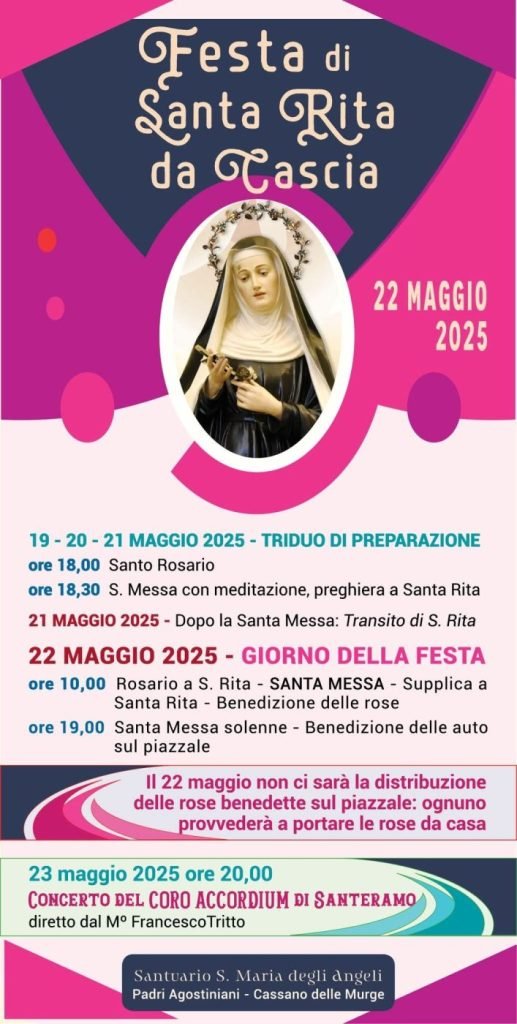 La santa agostiniana per eccellenza sarà celebrata con una Santa Messa alle ore 10.00, cui seguirà la Supplica e la benedizione delle rose (chi vorrà lo porterà da casa: non saranno distribuite presso il Convento), fiore caro alla santa di Cascia ed alle ore 19.00 con la santa messa solenne.