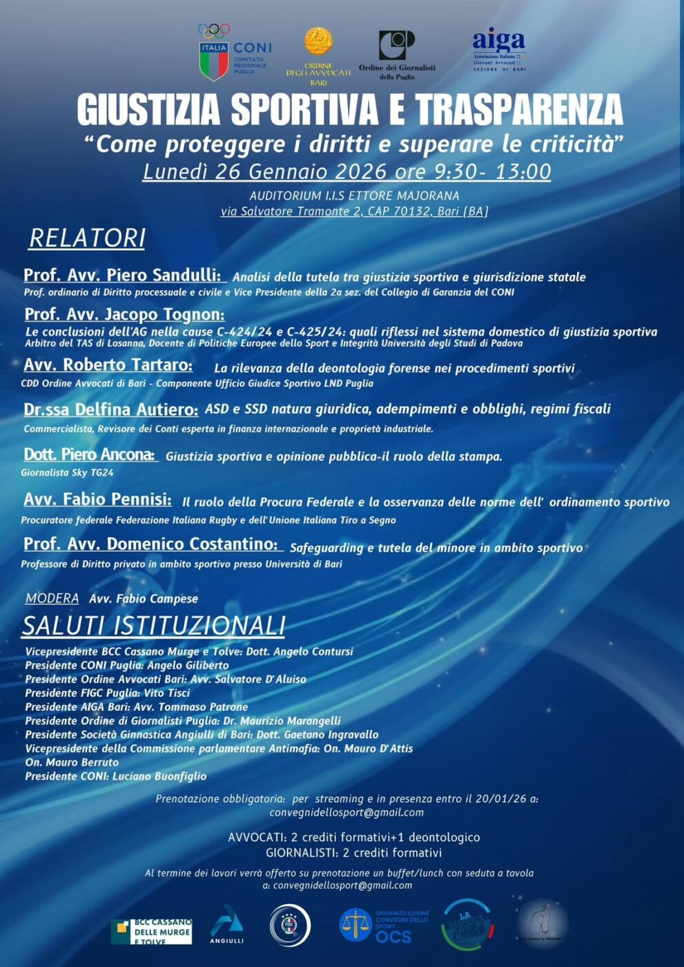 “Giustizia sportiva e trasparenza” è il titolo del seminario che si terrà lunedì 26 gennaio 2026, dalle ore 9:30 alle 13:00, presso l’auditorium dell’I.I.S. “Ettore Majorana” di Bari.