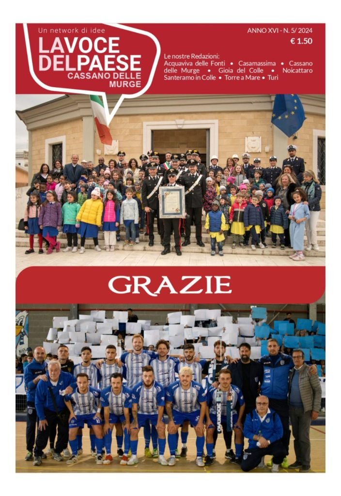 Abbiamo voluto dedicare la copertina a due fatti che hanno caratterizzato il mese di aprile: l’Encomio Solenne ai Carabinieri della locale Stazione e la promozione in serie C1 del Cassano Calcio a 5.