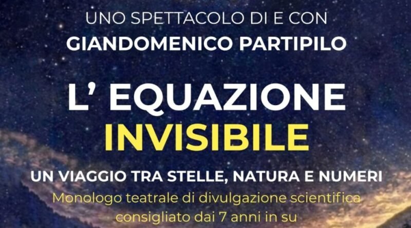 “L’Equazione Invisibile” è un monologo teatrale di divulgazione scientifica, pensato soprattutto per bambini e famiglie, consigliato dai 7 anni in su. In scena, l’autore accompagna il pubblico in un viaggio narrativo alla scoperta di come numeri, natura e stelle seguano le stesse regole invisibili.