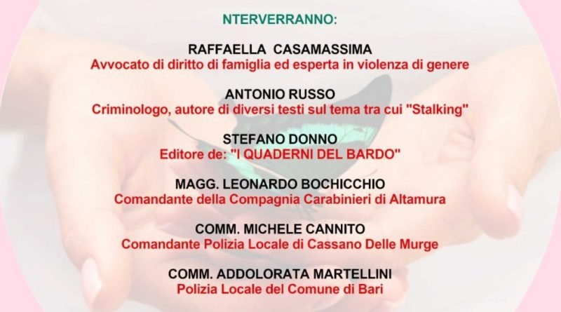 Con il patrocinio gratuito del Comune e della Polizia Locale di Cassano delle Murge, della Città Metropolitana di Bari e della Compagnia dei Carabinieri di Altamura, sarà moderato da Costanza Percoco, insegnante presso l’ I.C. Perotti-Ruffo e vedrà l’intervento di Raffaella Casamassima, avvocato esperto in diritto di famiglia e in violenza di genere, del criminologo Antonio Russo, autore di diversi libri sul tema tra i quali vi è “Stalking, storie di un crimine ordinario” (2023) il quale presenzierà con l’editore della C.E. “I Quaderni del Bardo”, il dott. Stefano Donno che ha reso possibile la pubblicazione del volume contenente le testimonianze di donne, vittime di violenza che, con le loro storie, si uniscono solidalmente per aiutare chi è attualmente intrappolato nella “gabbia” della fattispecie giuridica dello Stalking e della violenza.