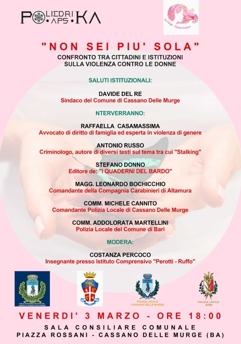 “Non sei più sola: confronto tra cittadini e istituzioni sulla violenza contro le donne” il titolo dell’incontro organizzato dall’Associazione “Poliedrika APS” in collaborazione con “No More – Difesa Donna” che avrà luogo a Cassano delle Murge venerdì 3 marzo 2023.