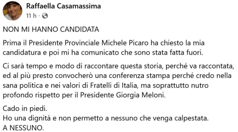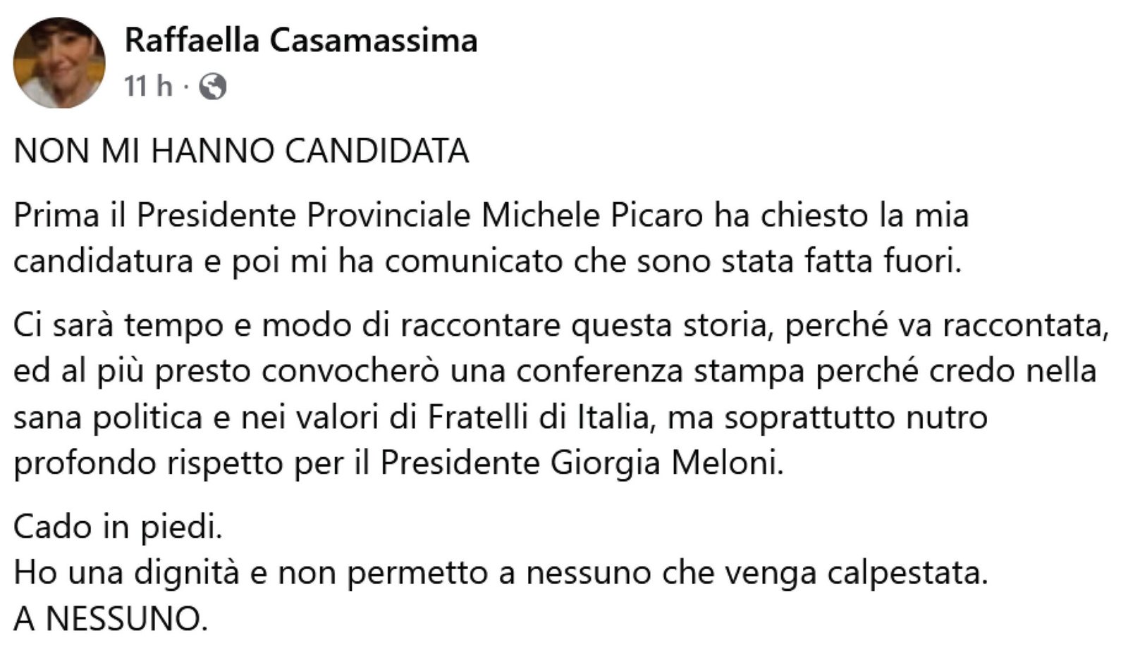 Ci sarà tempo e modo di raccontare questa storia, perché va raccontata, ed al più presto convocherò una conferenza stampa perché credo nella sana politica e nei valori di Fratelli di Italia, ma soprattutto nutro profondo rispetto per il Presidente Giorgia Meloni.