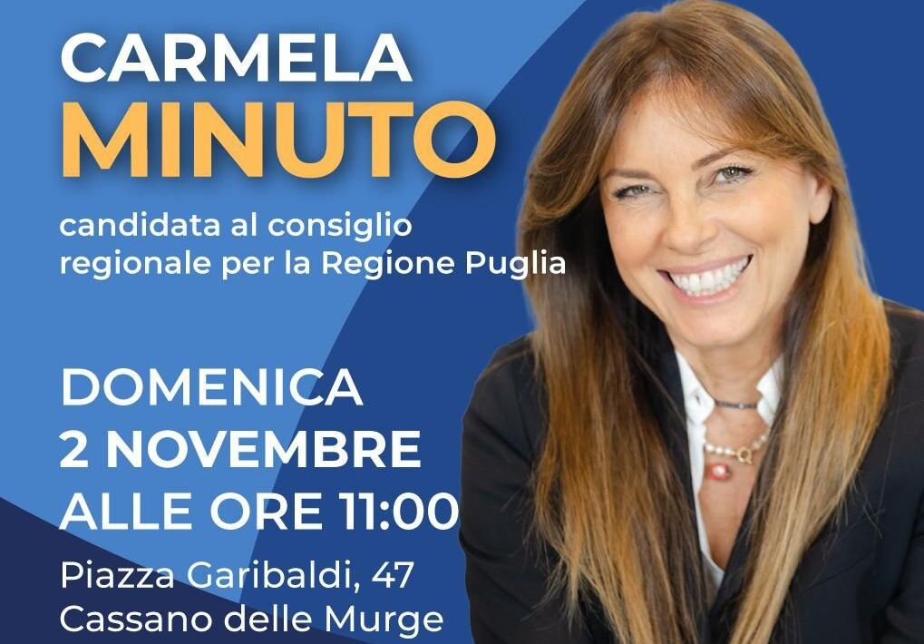 Sarà inaugurato il 2 novembre a Cassano delle Murge il Comitato Elettorale di Carmela Minuto, candidata al Consiglio Regionale della Puglia per Forza Italia, con Lobuono Presidente.