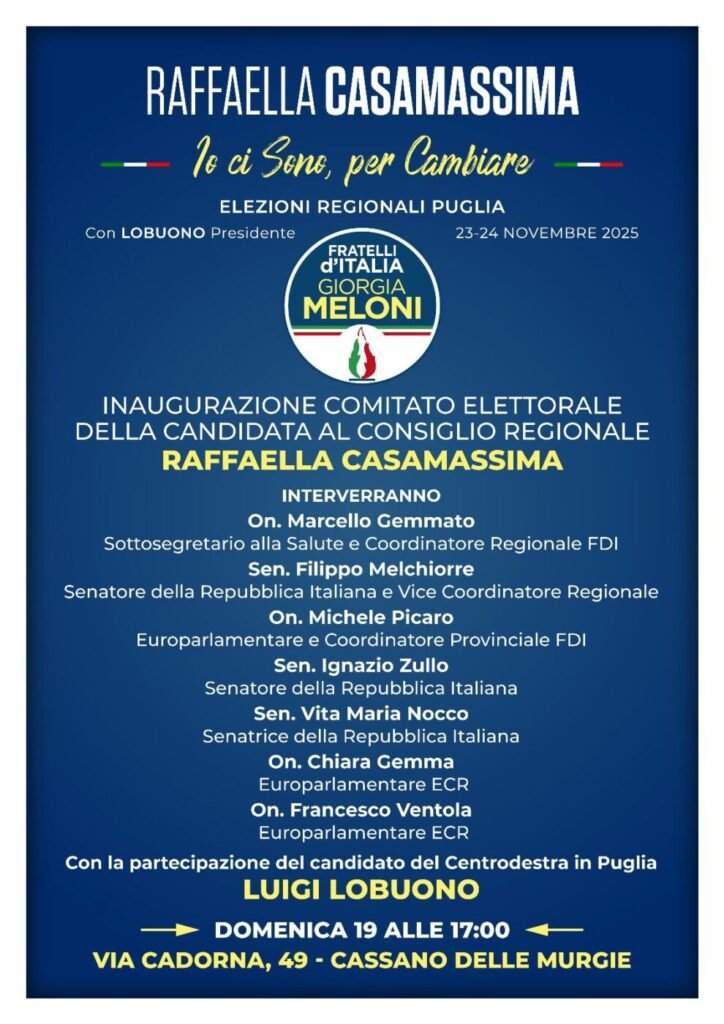 Domenica 19 ottobre alle ore 17.00 la candidata inaugurerà il suo Comitato Elettorale (in via Cadorna n. 49: prevista la partecipazione del Candidato Presidente della coalizione di centrodestra Luigi Lobuono e dello stato maggiore di Fratelli d’Italia: dal sottosegretario Marcello Gemmato al Senatore cassanese Ignazio Zullo. agli europarlamentari Ventola e Gemma.
