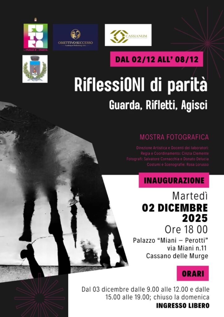 La mostra “Riflessioni di Parità” prosegue il suo cammino con la terza tappa a Cassano delle Murge, nell’ambito del progetto “Futura” del Consiglio Regionale della Puglia, dedicato alla promozione della parità di genere e alla sensibilizzazione sui diritti umani.