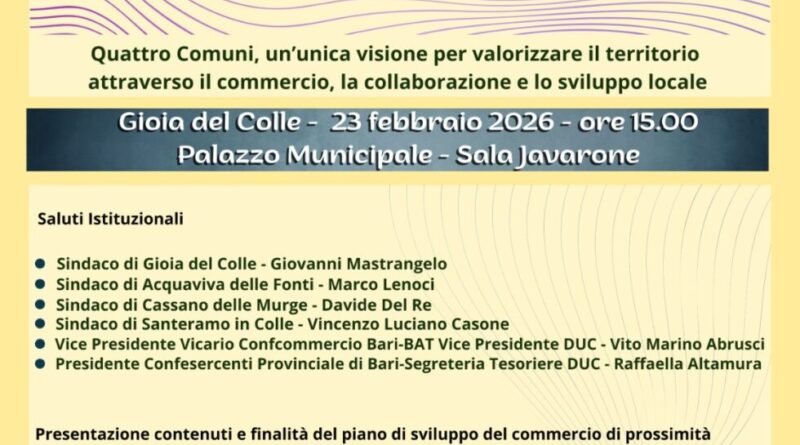Lunedì 23 febbraio 2026, alle ore 15:00, nella sala Javarone di Palazzo San Domenico si terrà l’evento “Terre di Murgia: un’aggregazione distrettuale per il futuro del commercio di prossimità”, promosso dai comuni di Gioia del Colle (capofila), Acquaviva delle Fonti, Cassano delle Murge e Santeramo in Colle in collaborazione con Confcommercio Bari-BAT e Confesercenti Puglia.