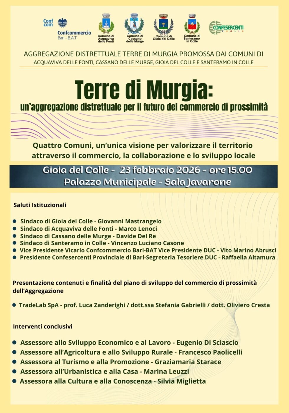 Lunedì 23 febbraio 2026, alle ore 15:00, nella sala Javarone di Palazzo San Domenico si terrà l’evento “Terre di Murgia: un’aggregazione distrettuale per il futuro del commercio di prossimità”, promosso dai comuni di Gioia del Colle (capofila), Acquaviva delle Fonti, Cassano delle Murge e Santeramo in Colle in collaborazione con Confcommercio Bari-BAT e Confesercenti Puglia.